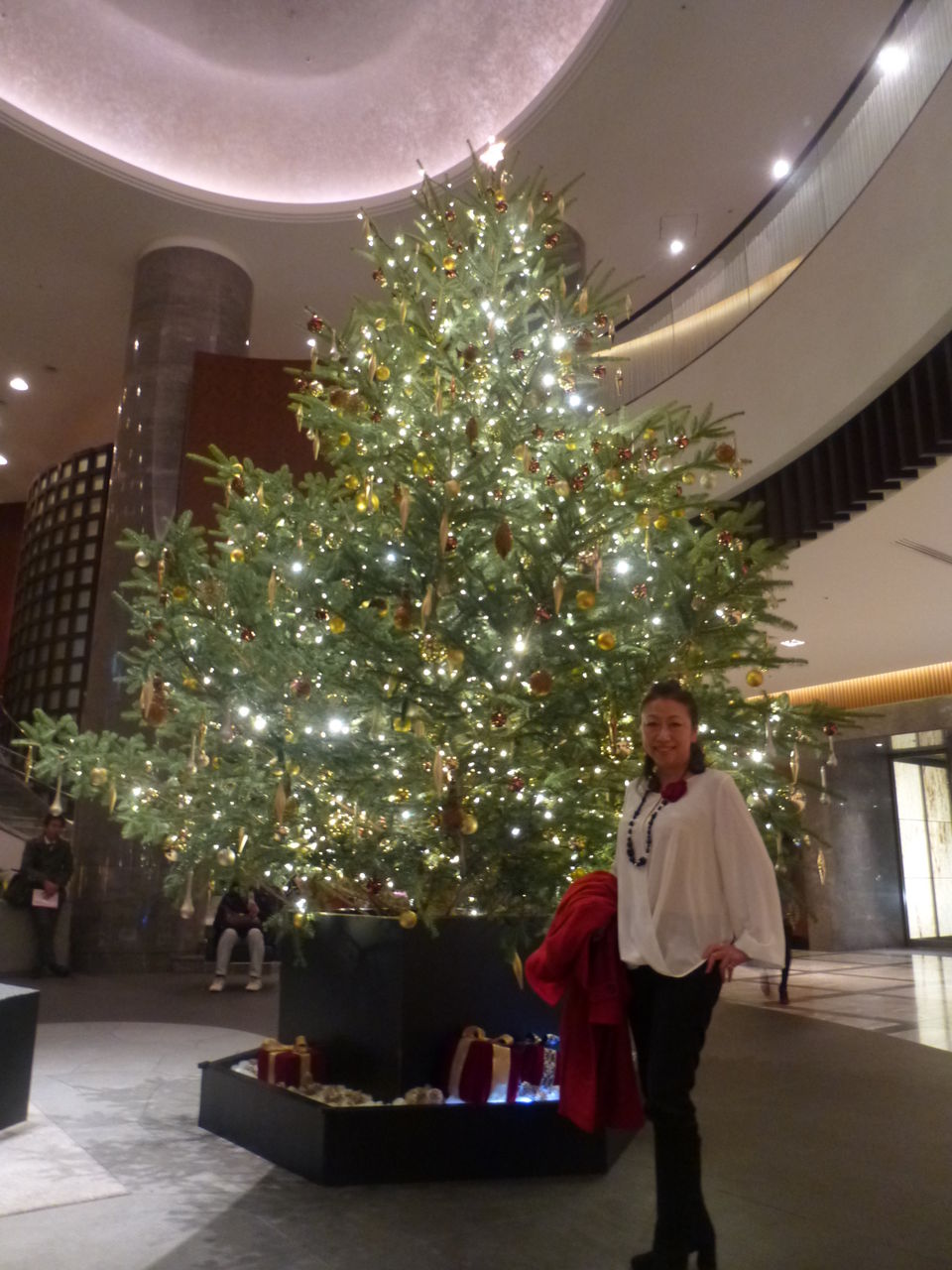 華やかなクリスマスツリーの前でも